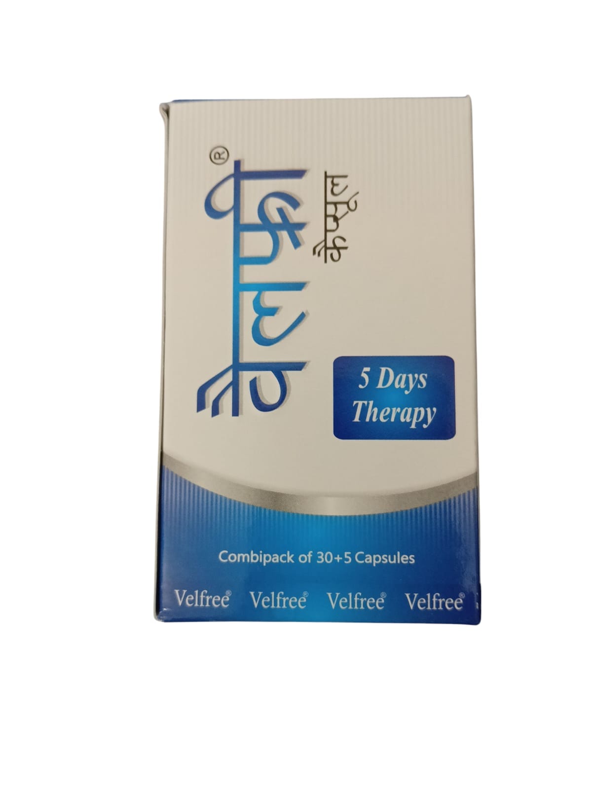 Velfree Capsule is a combination of (30+5) which is used for piles, bleeding piles and constipation. It is a 5 days therapy that includes red and green capsules.