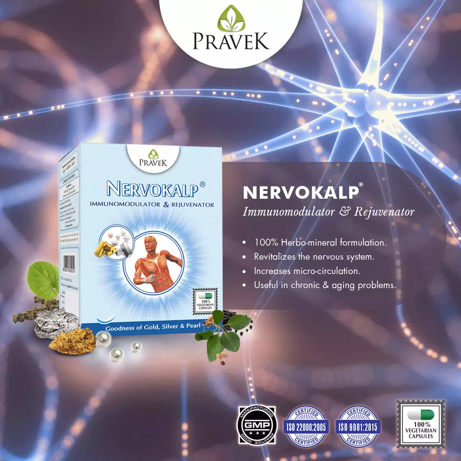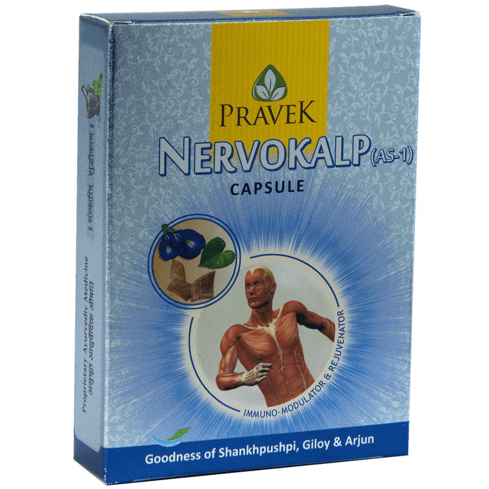 Pravek Nervokalp Capsule 5 is used for managing the nervous system and overall health. This herbo-mineral formula helps provide support for various conditions related to the nervous and musculoskeletal systems. It is designed to help improve circulation and promote general well-being. By focusing on memory retention and promoting microcirculation, Nervokalp aims to help support cognitive health. Additionally, it may help strengthen ligaments and tendons, contributing to improved physical resilience. The formulation serves as a tonic that helps support the body’s natural functions and revitalises energy levels. It is crafted to assist in maintaining balance within the body, offering a holistic approach to health. Its antioxidant properties and potential immune support help create a foundation for overall vitality and wellness.